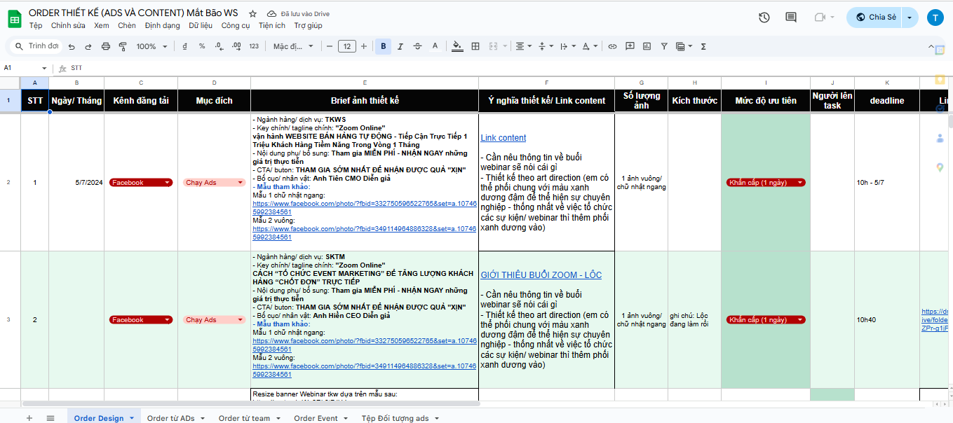 Trong mục này sẽ có cột ngày order, ngày deathline và mức độ ưu tiên (quan trọng – khẩn cấp , quan trọng – không khẩn cấp, không quan trọng – khẩn cấp ) để designer, editor biết việc nào cần làm trước việc nào làm sau và bám theo timeline để cung cấp sản phẩm kết quả trong khoảng thời gian phù hợp